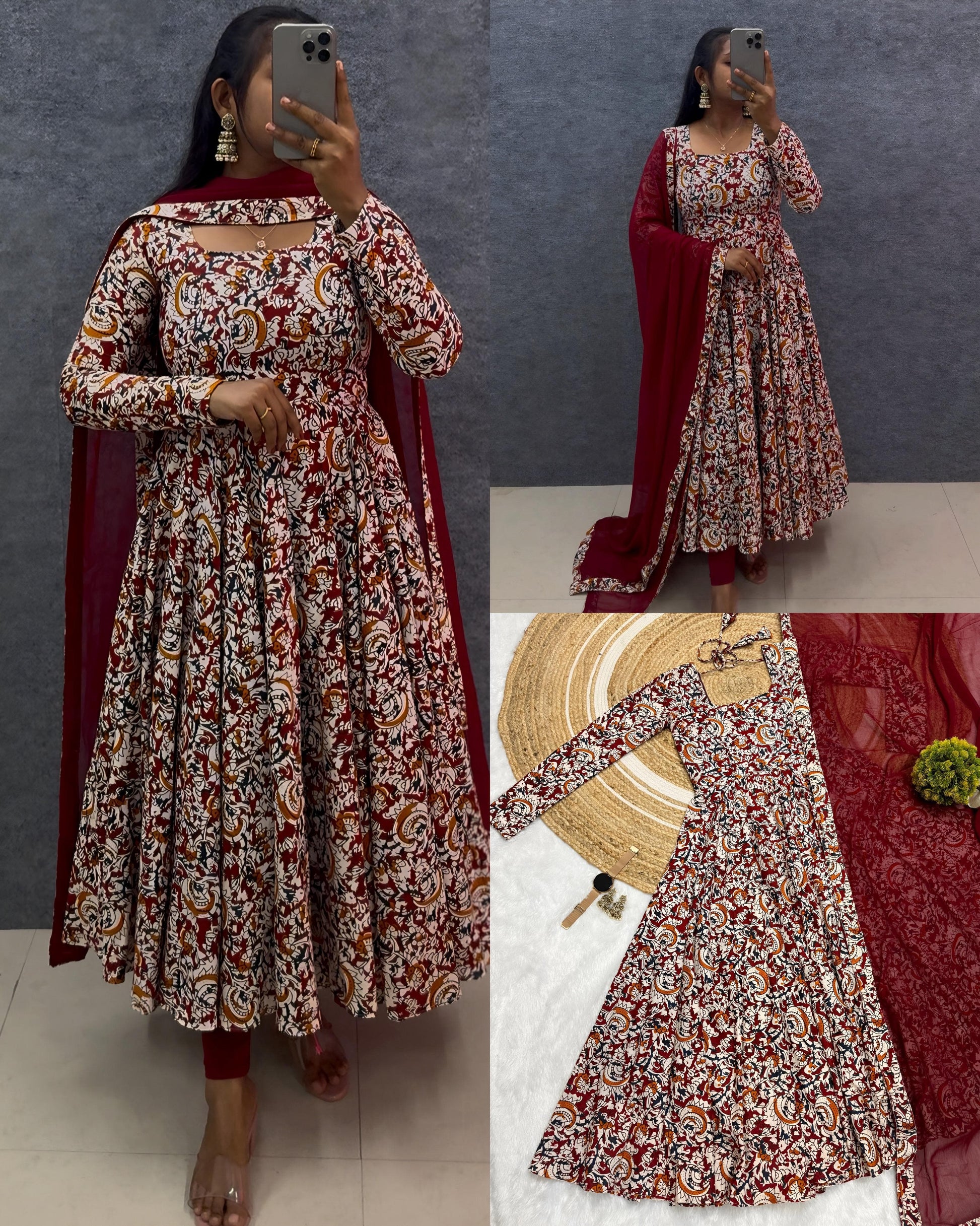 Elevate your ethnic wardrobe with a graceful Anarkali crafted from pure cotton hand-block printed Kalamkari fabric. This full-length silhouette blends traditional artistry with modern elegance. Paired with a luxurious kalamkari lace border georgette dupatta, it's perfect for festive occasions, , or cultural celebrations.